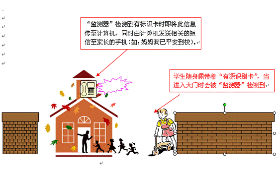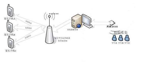 1. 系統(tǒng)原理:本系統(tǒng)的基本運用原理大致為每個學生只要帶有一枚RFID即無線感應標識卡,在到達學校大門后,校門附近的感應器就會讀到標識并將信息傳給計算機,由計算機分別向相關(guān)的學生父母手機發(fā)送一條短信,如“爸爸,我已平安到校了”“爸爸,我放學了,一會就回家”,同時在計算機中也會保存所有學生的進出信息,并將它整理成報表供學校、家長查詢。利用該短信平臺班主任可將每個學生的在校學習和生活情況等定時或不定時的集中或單獨發(fā)送至家長的手機,免去老師逐一通知或家長缺席家長會等情況而產(chǎn)生的各種交流屏障,方便快捷。該類似系統(tǒng)在美國、歐洲等發(fā)達國家已得到廣泛應用,已成為老師和家長溝通的橋梁, 廣受歡迎。